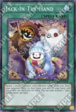 Reveal 3 Level 1 monsters with different names from your Deck, your opponent adds 1 to their hand, you add 1 to your hand, and you shuffle the third into the Deck. You can only activate 1 "Jack-In-The-Hand" per turn.