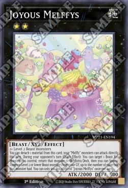 2+ Level 2 Beast monsters You can detach 1 material from this card; your "Melffy" monsters can attack directly this turn. During your opponent's turn (Quick Effect): You can target 1 Beast Xyz Monster you control; return that monster to the Extra Deck, then you can Special Summon Level 2 or lower Beast monsters from your GY, up to the number of materials that monster had. You can only use this effect of "Joyous Melffys" once per turn.