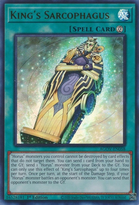 "Horus" monsters you control cannot be destroyed by card effects that do not target them. You can send 1 card from your hand to the GY; send 1 "Horus" monster from your Deck to the GY. You can only use this effect of "King's Sarcophagus" up to four times per turn. Once per turn, at the start of the Damage Step, if your "Horus" monster battles an opponent's monster: You can send that opponent's monster to the GY.