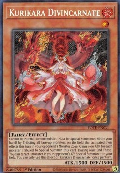 Cannot be Normal Summoned/Set. Must be Special Summoned (from your hand) by Tributing all face-up monsters on the field that activated their effects this turn in your opponent's Monster Zone. Gains 1500 ATK for each monster Tributed to Special Summon this card. During your End Phase: You can target 1 monster in your opponent's GY; Special Summon it to your field. You can only use this effect of "Kurikara Divincarnate" once per turn.