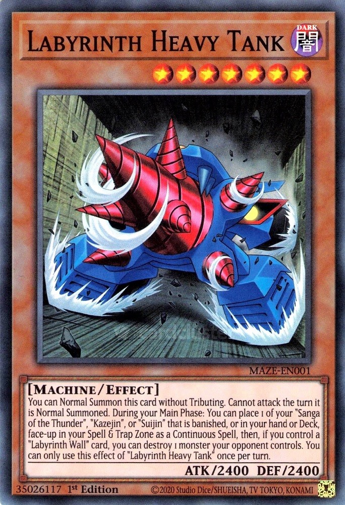 You can Normal Summon this card without Tributing. Cannot attack the turn it is Normal Summoned. During your Main Phase: You can place 1 of your "Sanga of the Thunder", "Kazejin", or "Suijin" that is banished, or in your hand or Deck, face-up in your Spell & Trap Zone as a Continuous Spell, then, if you control a "Labyrinth Wall" card, you can destroy 1 monster your opponent controls. You can only use this effect of "Labyrinth Heavy Tank" once per turn.