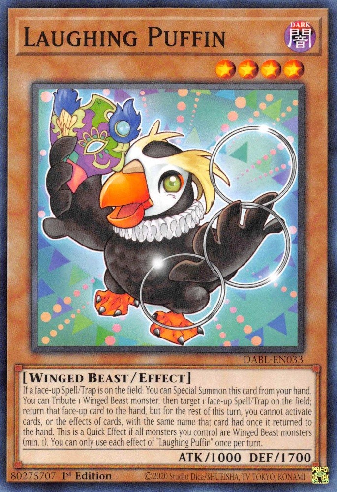 If a face-up Spell/Trap is on the field: You can Special Summon this card from your hand. You can Tribute 1 Winged Beast monster, then target 1 face-up Spell/Trap on the field; return that face-up card to the hand, but for the rest of this turn, you cannot activate cards, or the effects of cards, with the same name that card had once it returned to the hand. This is a Quick Effect if all monsters you control are Winged Beast monsters (min. 1). You can only use each effect of "Laughing Puffin" once per turn.