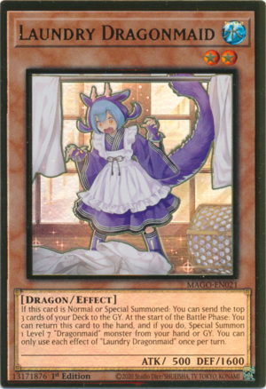 If this card is Normal or Special Summoned: You can send the top 3 cards of your Deck to the GY. At the start of the Battle Phase: You can return this card to the hand, and if you do, Special Summon 1 Level 7 "Dragonmaid" monster from your hand or GY. You can only use each effect of "Laundry Dragonmaid" once per turn.