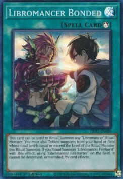 This card can be used to Ritual Summon any "Libromancer" Ritual Monster. You must also Tribute monsters from your hand or field whose total Levels equal or exceed the Level of the Ritual Monster you Ritual Summon. If you Ritual Summon "Libromancer Fireburst" with this effect, using "Libromancer Firestarter" on the field, it cannot be destroyed, or banished, by card effects.