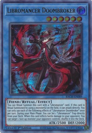 You can Ritual Summon this card with a "Libromancer" card. If this card is Ritual Summoned by using a monster(s) on the field, it can attack directly. You can only use each of the following effects of "Libromancer Doombroker" once per turn. During your Main Phase: You can Set 1 "Libromancer" Trap directly from your Deck. When this card inflicts battle damage to your opponent: You can target 1 face-up monster your opponent controls; shuffle it into the Deck.