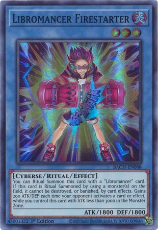 You can Ritual Summon this card with a "Libromancer" card. If this card is Ritual Summoned by using a monster(s) on the field, it cannot be destroyed, or banished, by card effects. Gains 200 ATK/DEF each time your opponent activates a card or effect, while you control this card with ATK less than 3000 in the Monster Zone.