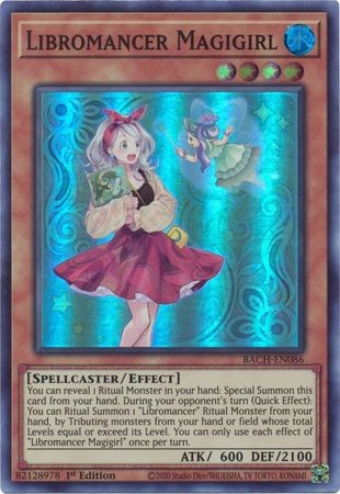 You can reveal 1 Ritual Monster in your hand: Special Summon this card from your hand. During your opponent's turn (Quick Effect): You can Ritual Summon 1 "Libromancer" Ritual Monster from your hand, by Tributing monsters from your hand or field whose total Levels equal or exceed its Level. You can only use each effect of "Libromancer Magigirl" once per turn.