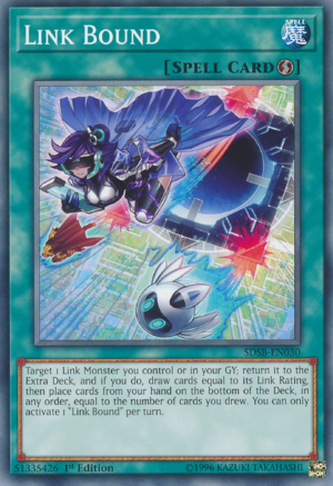 Target 1 Link Monster you control or in your GY; return it to the Extra Deck, and if you do, draw cards equal to its Link Rating, then place cards from your hand on the bottom of the Deck, in any order, equal to the number of cards you drew. You can only activate 1 "Link Bound" per turn.