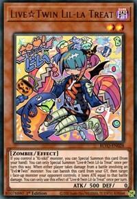 If you control a "Ki-sikil" monster, you can Special Summon this card (from your hand). You can only Special Summon "Live☆Twin Lil-la Treat" once per turn this way. When either player takes damage from a battle involving an "Evil★Twin" monster: You can banish this card from your GY, then target 1 face-up monster your opponent controls; it loses ATK equal to that battle damage. You can only use this effect of "Live☆Twin Lil-la Treat" once per turn.