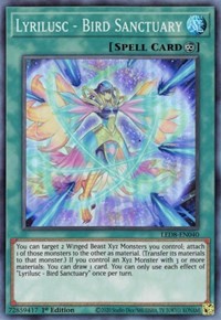 You can target 2 Winged Beast Xyz Monsters you control; attach 1 of those monsters to the other as material. (Transfer its materials to that monster.) If you control an Xyz Monster with 3 or more materials: You can draw 1 card. You can only use each effect of "Lyrilusc - Bird Sanctuary" once per turn.