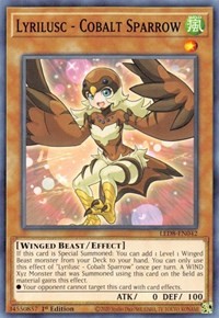 If this card is Special Summoned: You can add 1 Level 1 Winged Beast monster from your Deck to your hand. You can only use this effect of "Lyrilusc - Cobalt Sparrow" once per turn. A WIND Xyz Monster that was Summoned using this card on the field as material gains this effect.