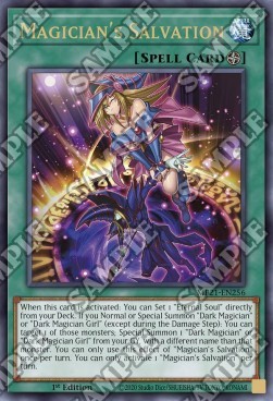 When this card is activated: You can Set 1 "Eternal Soul" directly from your Deck. If you Normal or Special Summon "Dark Magician" or "Dark Magician Girl" (except during the Damage Step): You can target 1 of those monsters; Special Summon 1 "Dark Magician" or "Dark Magician Girl" from your GY, with a different name than that monster. You can only use this effect of "Magician's Salvation" once per turn. You can only activate 1 "Magician's Salvation" per turn.
