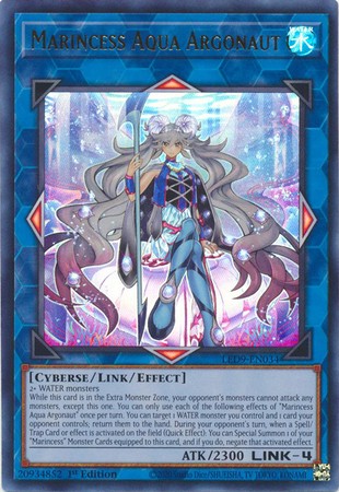 While this card is in the Extra Monster Zone, your opponent's monsters cannot attack any monsters, except this one. You can only use each of the following effects of "Marincess Aqua Argonaut" once per turn. You can target 1 WATER monster you control and 1 card your opponent controls; return them to the hand. During your opponent's turn, when a Spell/Trap Card or effect is activated on the field (Quick Effect): You can Special Summon 1 of your "Marincess" Monster Cards equipped to this card, and if you do, negate that activated effect.