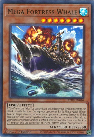If "Umi" is on the field: You can activate this effect; your WATER monsters can attack directly this turn. During your opponent's Battle Phase (Quick Effect): You can target 1 face-up monster your opponent controls; destroy it. If this card on the field is destroyed by battle or card effect: You can either add to your hand or Special Summon 1 WATER Warrior monster from your Deck or GY. You can only use each effect of "Mega Fortress Whale" once per turn.