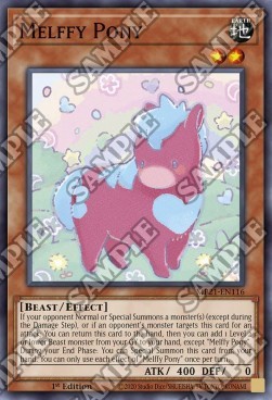 If your opponent Normal or Special Summons a monster(s) (except during the Damage Step), or if an opponent's monster targets this card for an attack: You can return this card to the hand, then you can add 1 Level 2 or lower Beast monster from your GY to your hand, except "Melffy Pony". During your End Phase: You can Special Summon this card from your hand. You can only use each effect of "Melffy Pony" once per turn.