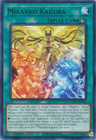 This card can be used to Ritual Summon any "Mikanko" Ritual Monster. You must also Tribute monsters from your hand or field whose total Levels equal or exceed the Level of the Ritual Monster you Ritual Summon. Then you can apply the following effect.