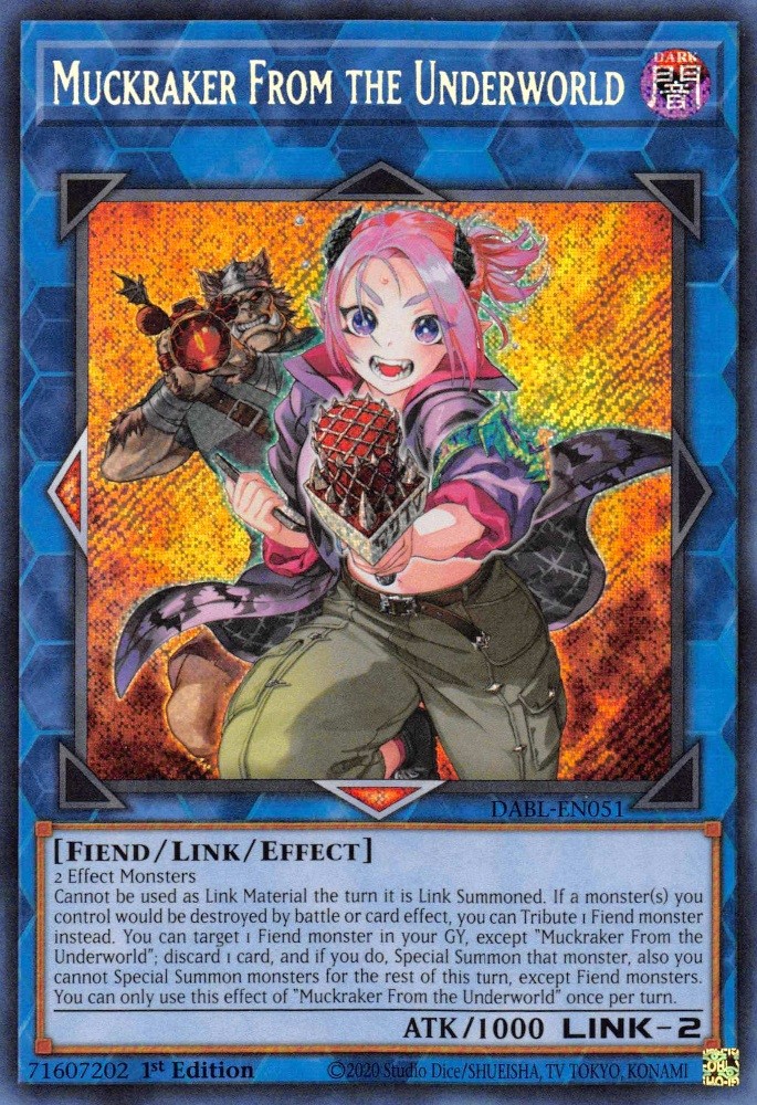 Cannot be used as Link Material the turn it is Link Summoned. If a monster(s) you control would be destroyed by battle or card effect, you can Tribute 1 Fiend monster instead. You can target 1 Fiend monster in your GY, except "Muckraker From the Underworld"; discard 1 card, and if you do, Special Summon that monster, also you cannot Special Summon monsters for the rest of this turn, except Fiend monsters. You can only use this effect of "Muckraker From the Underworld" once per turn.