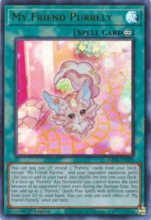You can pay 500 LP; reveal 3 "Purrely" cards from your Deck, except "My Friend Purrely", and your opponent randomly picks 1 for you to add to your hand, also shuffle the rest into your Deck. If a face-up "Purrely" Xyz Monster(s) you control leaves the field because of an opponent's card, even during the Damage Step: You can add up to 3 "Purrely" Quick-Play Spells with different names from your GY to your hand. You can only use each effect of "My Friend Purrely" once per turn.