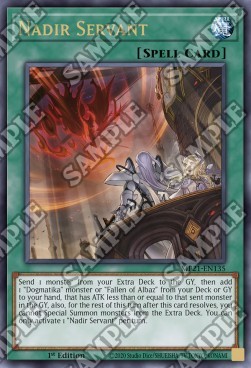 Send 1 monster from your Extra Deck to the GY, then add 1 "Dogmatika" monster or "Fallen of Albaz" from your Deck or GY to your hand, that has ATK less than or equal to that sent monster in the GY, also, for the rest of this turn after this card resolves, you cannot Special Summon monsters from the Extra Deck. You can only activate 1 "Nadir Servant" per turn.