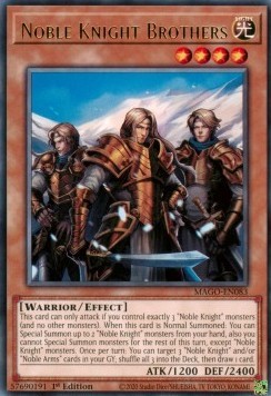 This card can only attack if you control exactly 3 "Noble Knight" monsters (and no other monsters). When this card is Normal Summoned: You can Special Summon up to 2 "Noble Knight" monsters from your hand, also you cannot Special Summon monsters for the rest of this turn, except "Noble Knight" monsters. Once per turn: You can target 3 "Noble Knight" and/or "Noble Arms" cards in your GY; shuffle all 3 into the Deck, then draw 1 card.