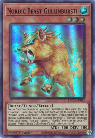 For a Synchro Summon, you can substitute this card for any 1 "Nordic" Tuner. You can only use each of the following effects of "Nordic Beast Gullinbursti" once per turn. If this card is Normal or Special Summoned: You can Special Summon 1 "Nordic" monster from your hand. You can target 1 "Nordic" monster in your GY, except "Nordic Beast Gullinbursti"; add it to your hand.