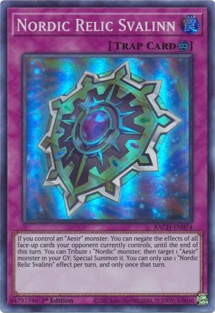 If you control an "Aesir" monster: You can negate the effects of all face-up cards your opponent currently controls, until the end of this turn. You can Tribute 1 "Nordic" monster, then target 1 "Aesir" monster in your GY; Special Summon it. You can only use 1 "Nordic Relic Svalinn" effect per turn, and only once that turn.