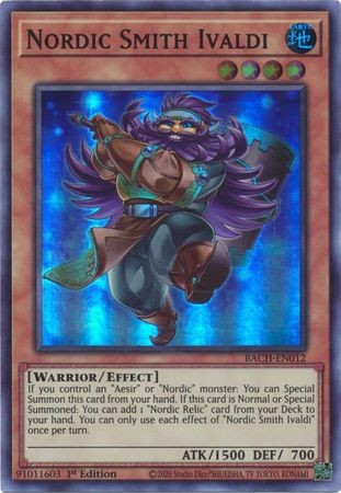 If you control an "Aesir" or "Nordic" monster: You can Special Summon this card from your hand. If this card is Normal or Special Summoned: You can add 1 "Nordic Relic" card from your Deck to your hand. You can only use each effect of "Nordic Smith Ivaldi" once per turn.