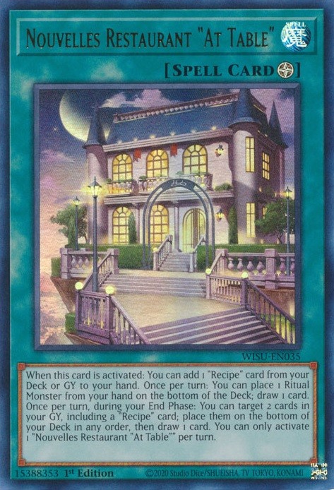 When this card is activated: You can add 1 "Recipe" card from your Deck or GY to your hand. Once per turn: You can place 1 Ritual Monster from your hand on the bottom of the Deck; draw 1 card. Once per turn, during your End Phase: You can target 2 cards in your GY, including a "Recipe" card; place them on the bottom of your Deck in any order, then draw 1 card. You can only activate 1 "Nouvelles Restaurant "At Table"" per turn.