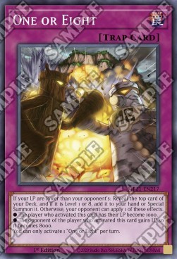 If your LP are lower than your opponent's: Reveal the top card of your Deck, and if it is Level 1 or 8, add it to your hand or Special Summon it. Otherwise, your opponent can apply 1 of these effects. ● The player who activated this card has their LP become 1000. ● The opponent of the player who activated this card gains LP so it becomes 8000. You can only activate 1 "One or Eight" per turn.