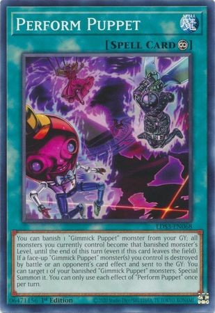 You can banish 1 "Gimmick Puppet" monster from your GY; all monsters you currently control become that banished monster's Level, until the end of this turn (even if this card leaves the field). If a face-up "Gimmick Puppet" monster(s) you control is destroyed by battle or an opponent's card effect and sent to the GY: You can target 1 of your banished "Gimmick Puppet" monsters; Special Summon it. You can only use each effect of "Perform Puppet" once per turn.