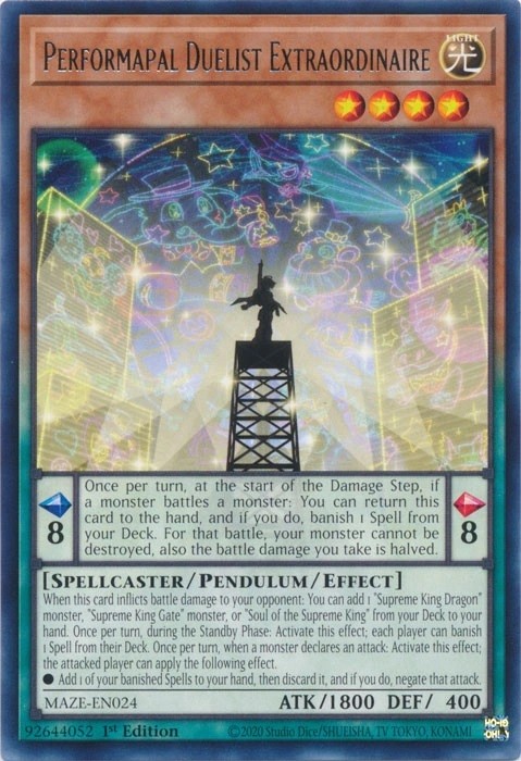 Pendulum Effect: Once per turn, at the start of that Damage Step, if a monster battles another monster: You can return this card to the hand, and if you do, banish 1 Spell from your Deck, also your monster cannot be destroyed by that battle, also halve any battle damage you take from it.