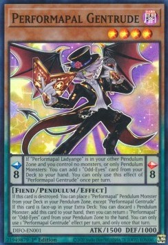 Pendulum Effect If "Performapal Ladyange" is in your other Pendulum Zone and you control no monsters, or only Pendulum Monsters: You can add 1 "Odd-Eyes" card from your Deck to your hand. You can only use this effect of "Performapal Gentrude" once per turn. Monster Effect If this card is destroyed: You can place 1 "Performapal" Pendulum Monster from your Deck in your Pendulum Zone, except "Performapal Gentrude". If this card is face-up in your Extra Deck: You can discard 1 Pendulum Monster; add this card to your hand, then you can return 1 "Performapal" or "Odd-Eyes" card from your Pendulum Zone to the hand. You can only use 1 "Performapal Gentrude" effect per turn, and only once that turn.