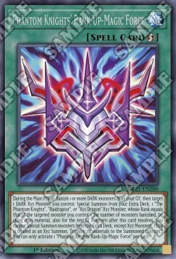 During the Main Phase: Banish 1 or more DARK monsters from your GY, then target 1 DARK Xyz Monster you control; Special Summon from your Extra Deck, 1 "The Phantom Knights", "Raidraptor", or "Xyz Dragon" Xyz Monster, whose Rank equals that of the targeted monster you control + the number of monsters banished, by using it as material, also for the rest of this turn after this card resolves, you cannot Special Summon monsters from the Extra Deck, except Xyz Monsters. (This is treated as an Xyz Summon. Transfer its materials to the Summoned monster.) You can only activate 1 "Phantom Knights' Rank-Up-Magic Force" per turn.