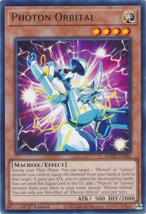 During your Main Phase: You can target 1 "Photon" or "Galaxy" monster you control; equip this monster from your hand or field to that target. It gains 500 ATK, also it cannot be destroyed by battle. You can send this Equip Card to the GY; add 1 "Photon" or "Galaxy" monster from your Deck to your hand, except "Photon Orbital". You can only use this effect of "Photon Orbital" once per turn.