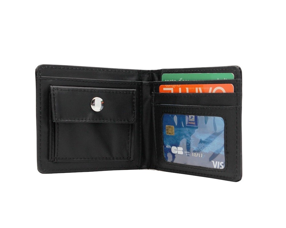 Το πορτοφόλι έχει κούμπωμα, θέσεις για κάρτες και ξεχωριστή θήκη για κέρματα.