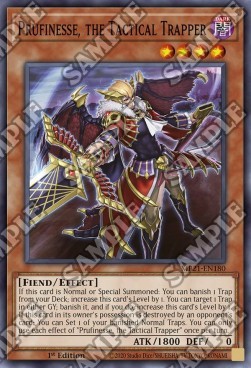If this card is Normal or Special Summoned: You can banish 1 Trap from your Deck; increase this card's Level by 1. You can target 1 Trap in either GY; banish it, and if you do, increase this card's Level by 1. If this card in its owner's possession is destroyed by an opponent's card: You can Set 1 of your banished Normal Traps. You can only use each effect of "Prufinesse, the Tactical Trapper" once per turn.