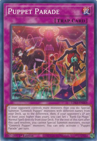 If your opponent controls more monsters than you do: Special Summon "Gimmick Puppet" monsters with different names from your Deck, up to the difference, then, if your opponent's LP are at least 2000 higher than yours, you can Set 1 "Rank-Up-Magic" Normal Spell directly from your Deck. For the rest of this turn after this card resolves, you cannot Special Summon monsters, except "Gimmick Puppet" monsters. You can only activate 1 "Puppet Parade" per turn.