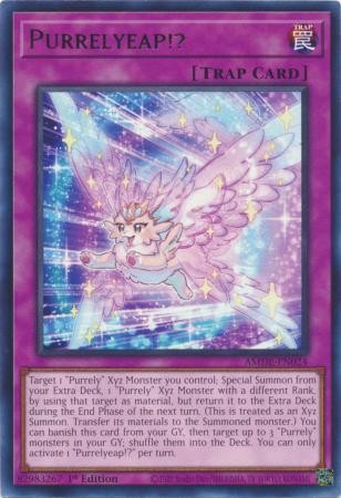 Target 1 "Purrely" Xyz Monster you control; Special Summon from your Extra Deck, 1 "Purrely" Xyz Monster with a different Rank, by using that target as material, but return it to the Extra Deck during the End Phase of the next turn. (This is treated as an Xyz Summon. Transfer its materials to the Summoned monster.) You can banish this card from your GY, then target up to 3 "Purrely" monsters in your GY; shuffle them into the Deck. You can only activate 1 "Purrelyeap!?" per turn.