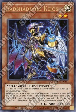 FLIP: You can Special Summon 1 "Shaddoll" monster from your hand in face-up or face-down Defense Position. If this card is sent to the GY by a card effect: You can send 1 "Shaddoll" monster from your hand to the GY, and if you do, for the rest of this turn, all monsters you control gain ATK/DEF equal to the original Level of that monster sent to the GY x 100. You can only use 1 "Qadshaddoll Keios" effect per turn, and only once that turn.