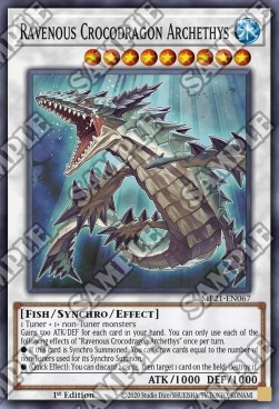 1 Tuner + 1+ non-Tuner monsters Gains 500 ATK/DEF for each card in your hand. You can only use each of the following effects of "Ravenous Crocodragon Archethys" once per turn. ● If this card is Synchro Summoned: You can draw cards equal to the number of non-Tuners used for its Synchro Summon. ● (Quick Effect): You can discard 2 cards, then target 1 card on the field; destroy it.