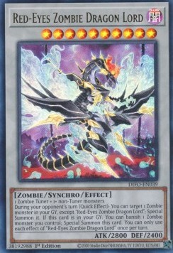 During your opponent's turn (Quick Effect): You can target 1 Zombie monster in your GY, except "Red-Eyes Zombie Dragon Lord"; Special Summon it. If this card is in your GY: You can banish 1 Zombie monster you control; Special Summon this card. You can only use each effect of "Red-Eyes Zombie Dragon Lord" once per turn.