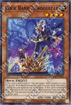 If this card is sent to the GY: You can target 1 Rock monster in your GY, except "Rock Band Xenoguitar"; add it to your hand, then place 1 card from your hand on top of the Deck. If this card is banished from the field or GY: You can send 1 Rock monster from your Deck to the GY. You can only use each effect of "Rock Band Xenoguitar" once per turn.