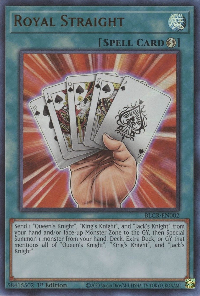 Send 1 "Queen's Knight", "King's Knight", and "Jack's Knight" from your hand and/or face-up Monster Zone to the GY, then Special Summon 1 monster from your hand, Deck, Extra Deck, or GY that mentions all of "Queen's Knight", "King's Knight", and "Jack's Knight".