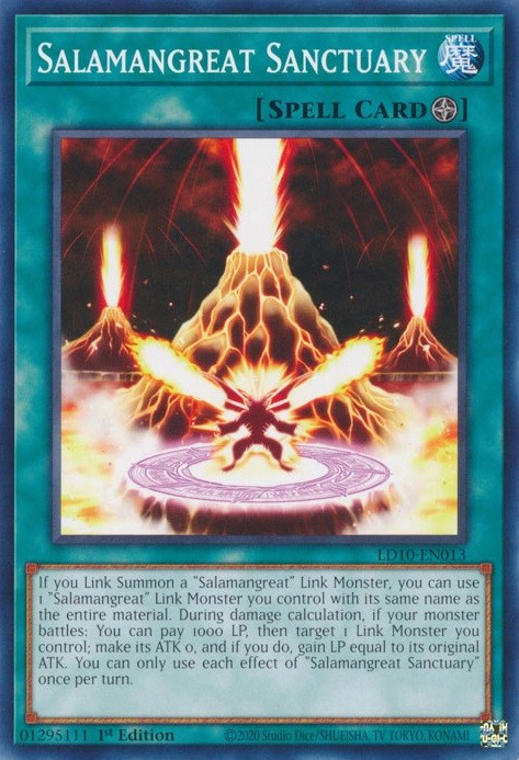 If you Link Summon a "Salamangreat" Link Monster, you can use 1 "Salamangreat" Link Monster you control with its same name as the entire material. During damage calculation, if your monster battles: You can pay 1000 LP, then target 1 Link Monster you control; make its ATK 0, and if you do, gain LP equal to its original ATK. You can only use each effect of "Salamangreat Sanctuary" once per turn.