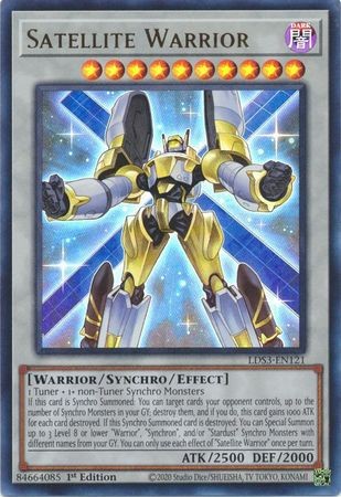 If this card is Synchro Summoned: You can target cards your opponent controls, up to the number of Synchro Monsters in your GY; destroy them, and if you do, this card gains 1000 ATK for each card destroyed. If this Synchro Summoned card is destroyed: You can Special Summon up to 3 Level 8 or lower "Warrior", "Synchron", and/or "Stardust" Synchro Monsters with different names from your GY. You can only use each effect of "Satellite Warrior" once per turn.