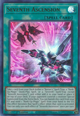 Take 1 card from your Deck (either a "Barian's" Spell/Trap, a "Rank-Up-Magic" Quick-Play Spell, or a "Seventh" Spell/Trap except "Seventh Ascension"), and either add it to your hand or place it on top of your Deck. If your opponent controls a monster Special Summoned from the Extra Deck: You can banish this card from your GY and send 1 "Rank-Up-Magic" Spell from your hand to the GY; this effect becomes that Spell's effect when that card is activated. You can only use each effect of "Seventh Ascension" once per turn.