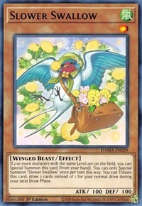 If 2 or more monsters with the same Level are on the field, you can Special Summon this card (from your hand). You can only Special Summon "Slower Swallow" once per turn this way. You can Tribute this card; draw 2 cards instead of 1 for your normal draw during your next Draw Phase.