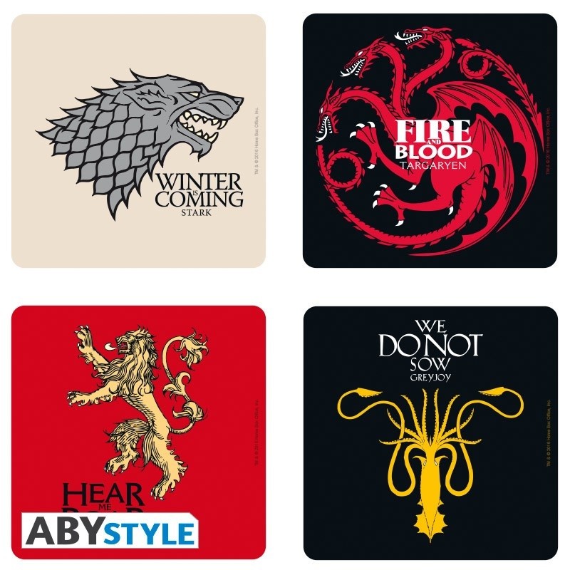 Σετ από 4 σουβέρ με τα σύμβολα τεσσάρων οίκων (Targaryen, Stark, Lannister, Greyjoy) από την τηλεοπτική σειρά Game of Thrones.
