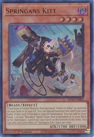 If you have a Fusion Monster that mentions "Fallen of Albaz" as material on your field or in your GY: You can Special Summon this card from your hand. If this card is Normal or Special Summoned: You can add to your hand, 1 of your "Branded" Spells/Traps that is banished or in your Deck or GY, then place 1 card from your hand on the bottom of the Deck. You can only use each effect of "Springans Kitt" once per turn.