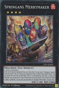 If this card is Special Summoned from your Extra Deck: You can send 1 "Springans" monster from your Deck to the GY. During your opponent's Main or Battle Phase (Quick Effect): You can banish this card until the End Phase, then if you banished this card with 2 or more Xyz Materials, you can also send 1 Fusion Monster from your Extra Deck to the GY that lists "Fallen of Albaz" as material. You can only use each effect of "Springans Merrymaker" once per turn.
